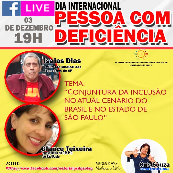 O Setorial das Pessoas com Deficiência do PSOL do Estado de São Paulo, realizará nesta quinta-feira 03 de dezembro, das 19h00 às 20h30, em comemoração ao Dia Internacional da Pessoa com Deficiência, uma análise de conjuntura sobre o processo de inclusão de pessoas com deficiência no atual cenário nacional e no estado de São Paulo.…